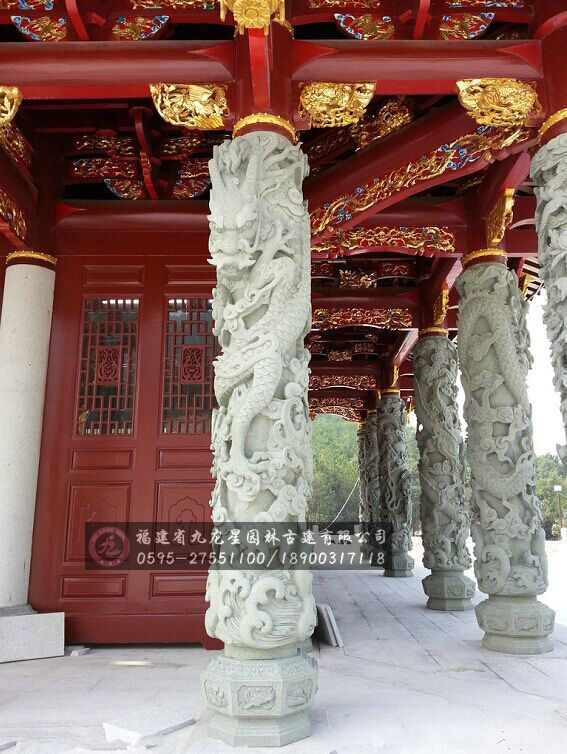 石雕(青石)龍柱通常被設計為龍身環繞柱身一圈,龍尾在上,龍頭在下,取其從天而降之氣勢,龍頭上昂,龍爪握珠。圓柱通身塑有纏柱云龍,柱上橫貫一塊美麗的云板,好似行云插入云際。頂端承露盤上的蹲獸,栩栩如生。素有吉祥、華貴、誠信等意。
