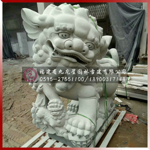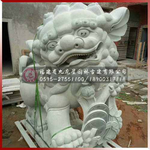 石雕獻線獅是因石獅造型前一般常飾一串古錢而得名,它是南方石獅當中的一種造型。獻錢獅寓有招財進寶之意,造型可愛乖巧,富有靈性。它是漢族民間最為常見的一種石獅造型之一,常擺放于寺廟或是祠堂門前。獻錢獅一般也為雌雄一對,雄獅常飾于大串的銅錢,寓意招財進寶。而雌獅則戲玩著小獅子,寓意人丁興旺之意。