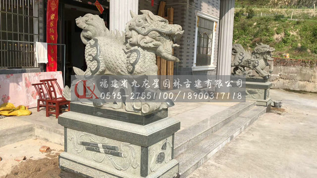 麒麟造型中石刻麒麟多在建筑、皇家建筑里出現,其體型巨大,多以威武雄健之態出現。這說明,麒麟造型的比例尺寸大小是與特定的環境、風俗、情感相聯系的。石雕麒麟的大也可以解釋為大氣、圣威、權利,具有震懾的作用。石雕麒麟的造型遵循著傳統文化審美的習慣,麒麟的造型特征說明其造物意象充滿了對美好與吉祥的期望。石雕麒麟的整個造型集龍頭、鹿角、獅眼、虎背、熊腰、蛇鱗、馬蹄、豬尾于一身,另外使用添加手法在下頜處加有長長的胡須,又添加翅膀,這樣,麒麟可以奔跑,可以飛翔,威武之勢讓人可望不可及。麒麟體現了古人對現實世界的主觀理想與造物的主動性,其和龍、鳳一樣成了我國傳統民族精神的象征。還有,石雕麒麟的擺放一般是成雙成對出現的,主要因為其造型講究碩大豐滿,還注重陰陽相守,忌諱殘缺不全、形單影只,其中寄托了人們“天人和諧”的精神追求,內涵獨特而豐富。