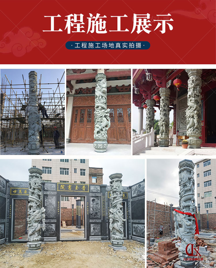 福建廠石雕龍柱產品構成為柱礎、柱身、柱頭(柱帽)三部分,龍柱一般為圓柱形,通身雕刻有纏柱云龍,適用于宮觀寺院、宗祠古厝、園林景觀、廣場擺件等,常用石料為花崗巖與青石。